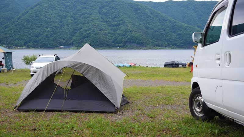 富士五湖の1つ西湖に位置する「自由キャンプ場」にて、最高のキャンプはスタート。