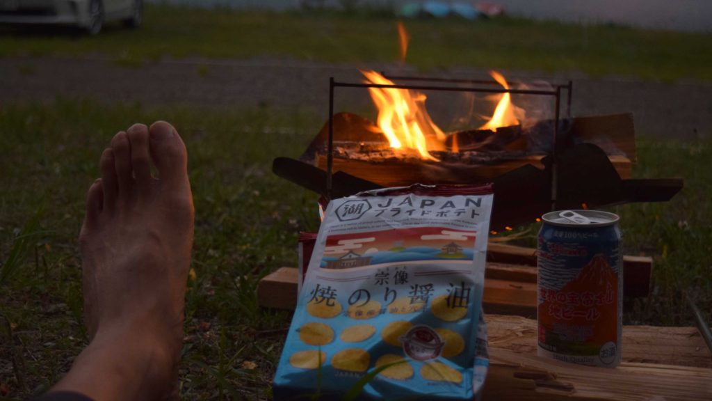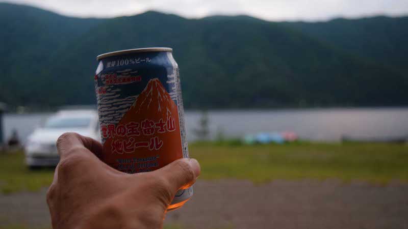 ちょっと意識して買った富士山の地ビールを開けて、焚き火でウインナー焼いて、、、
