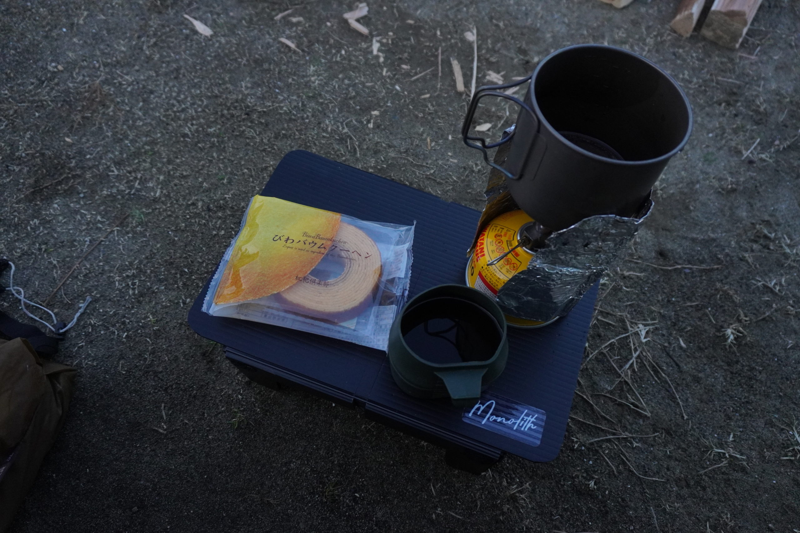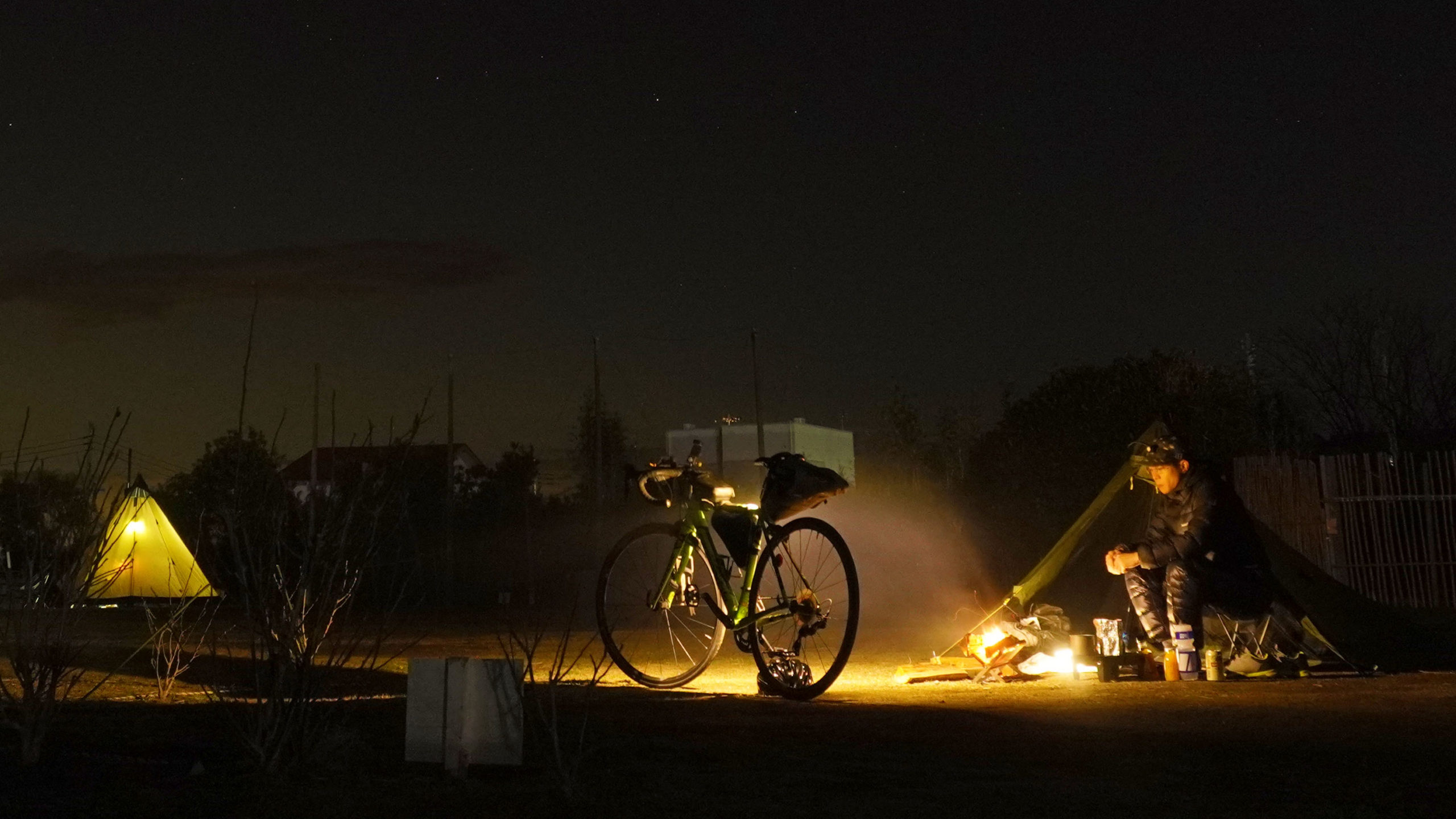 焚き火と愛車のロードバイクとご当地のびわジュースを眺めつつ、暗くなるまで外でだらだらお酒タイムしておりましたね。