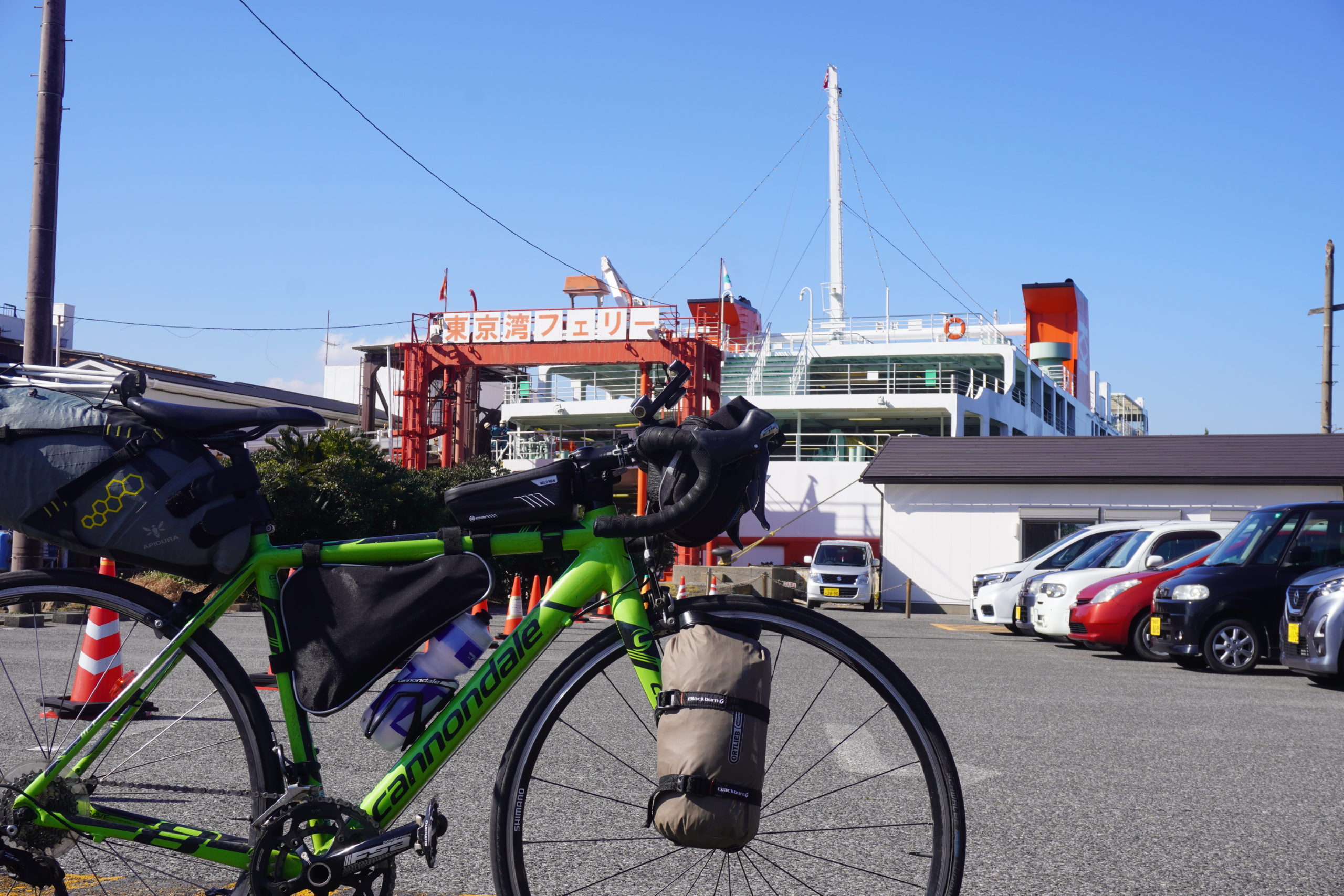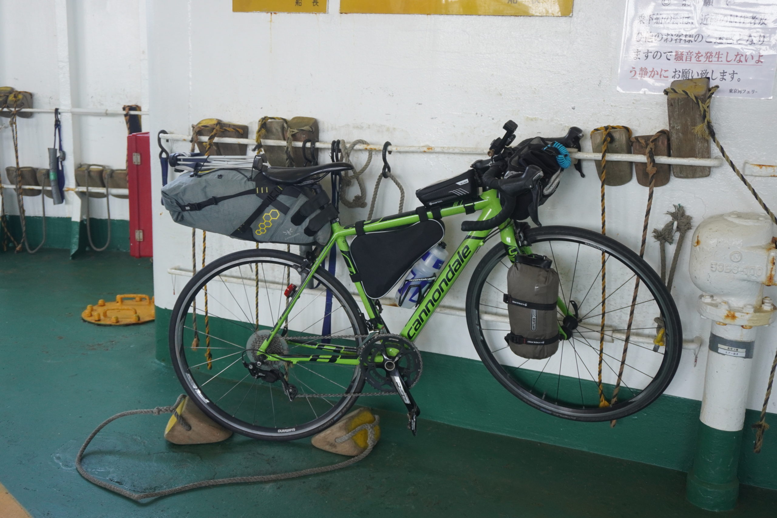 バイクパッキングシステムで私の愛車のロードバイクにキャンプ道具を積載させたまま、フェリーに乗り込みます。