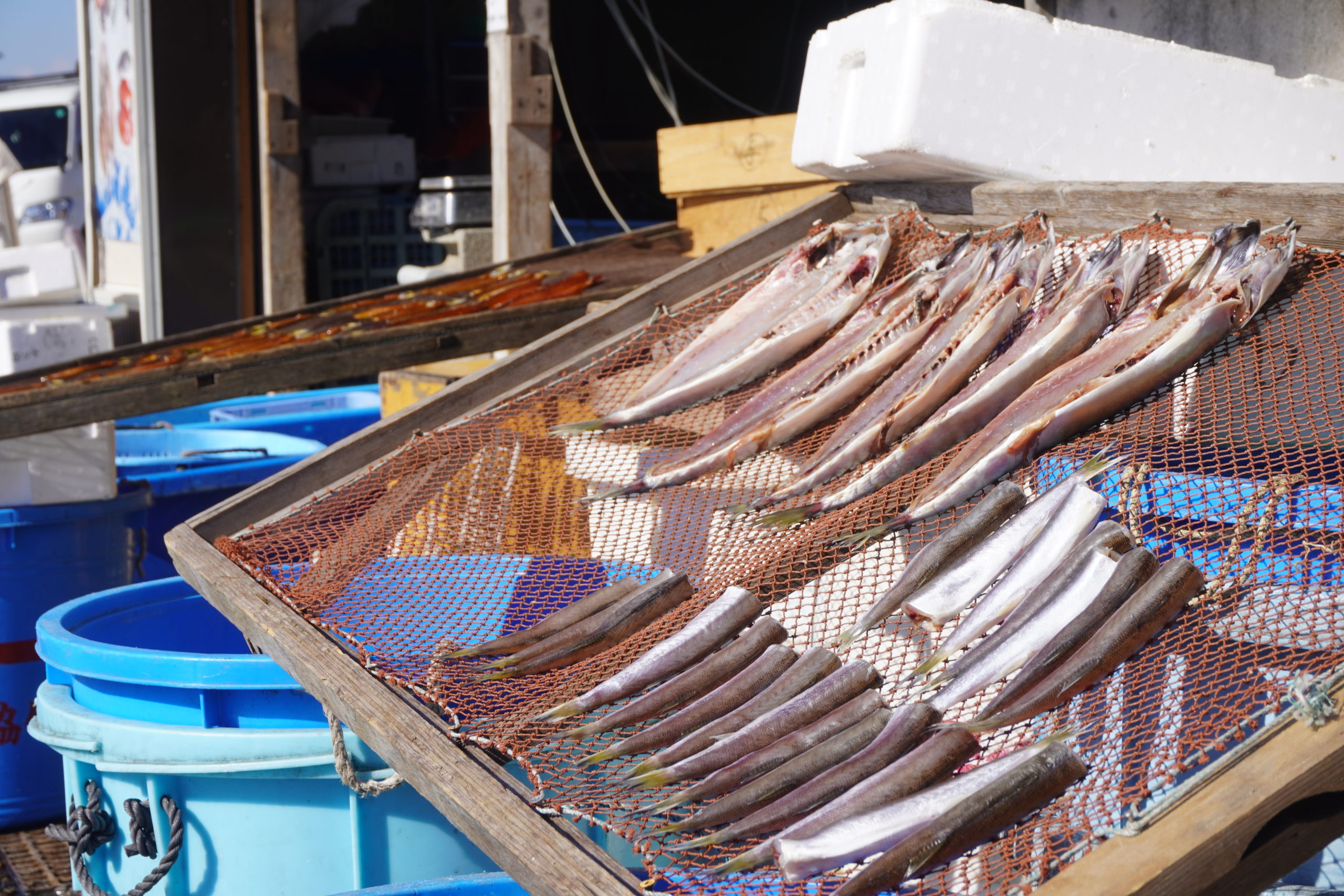 金谷港のすぐ側には早速ご当地を感じれるような魚の天日干しを見ることができたり、海鮮丼屋さんもありました。