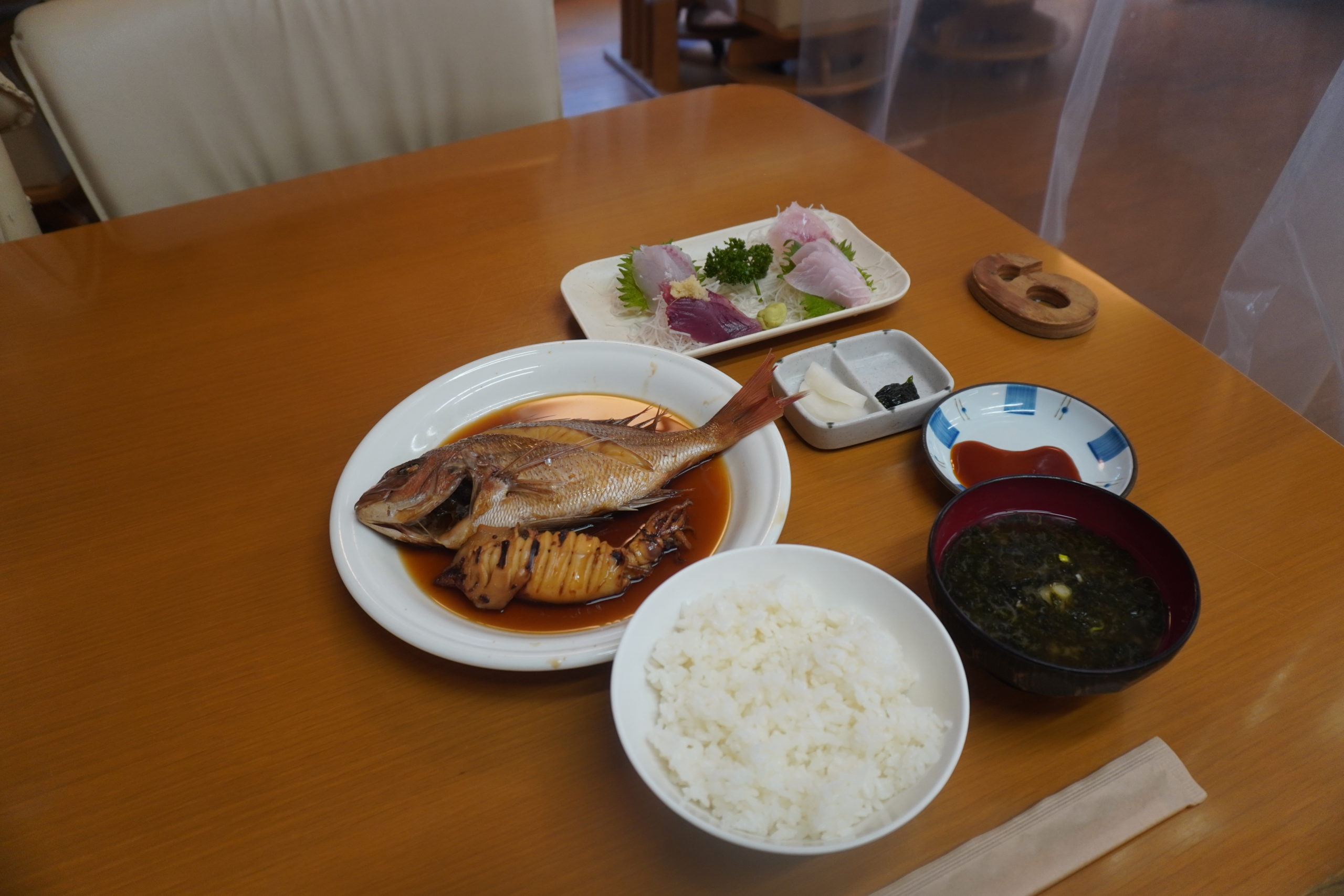 鯛とイカの煮付けに刺し身の盛り合わせ。そしてご飯にお味噌汁といった定食です。