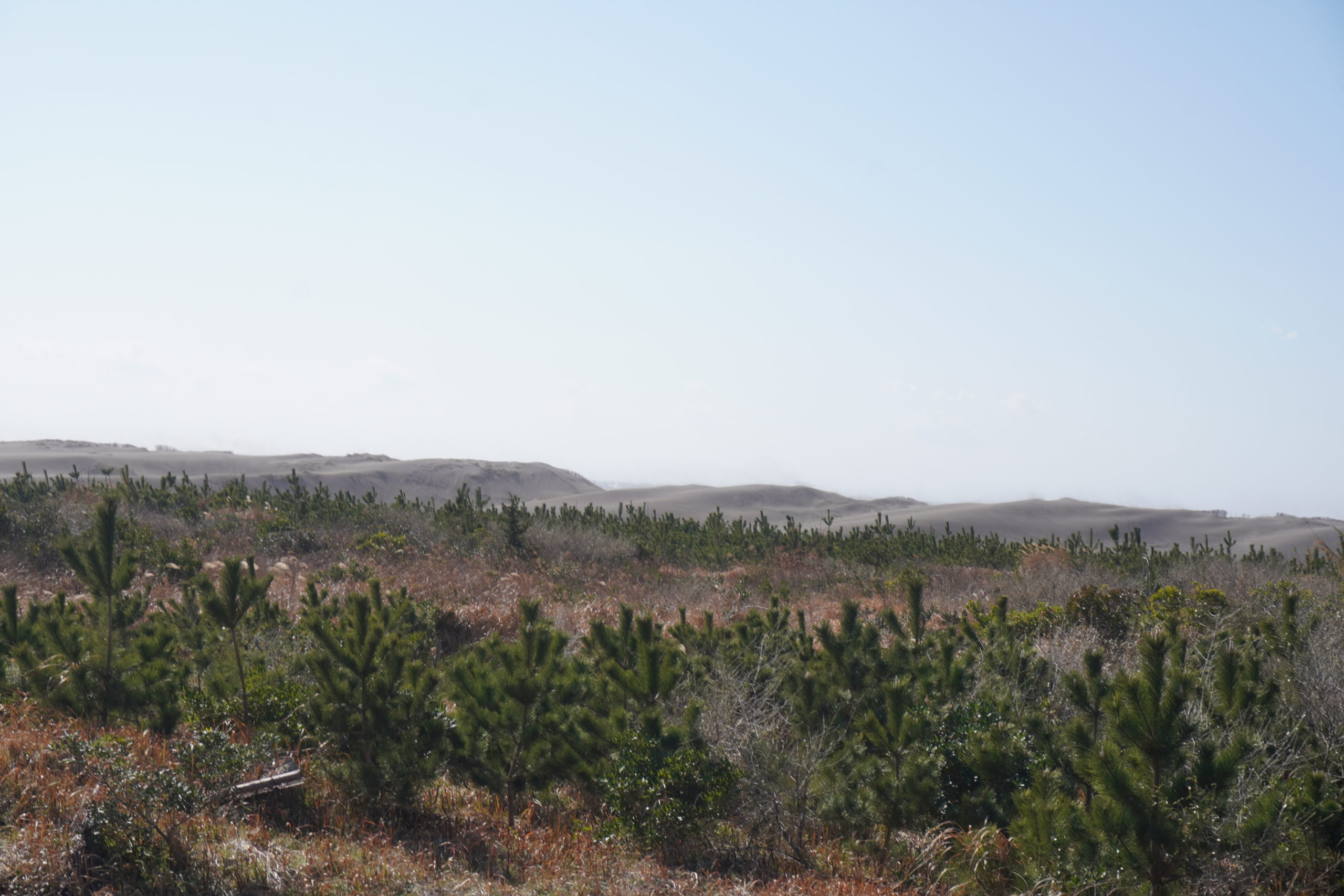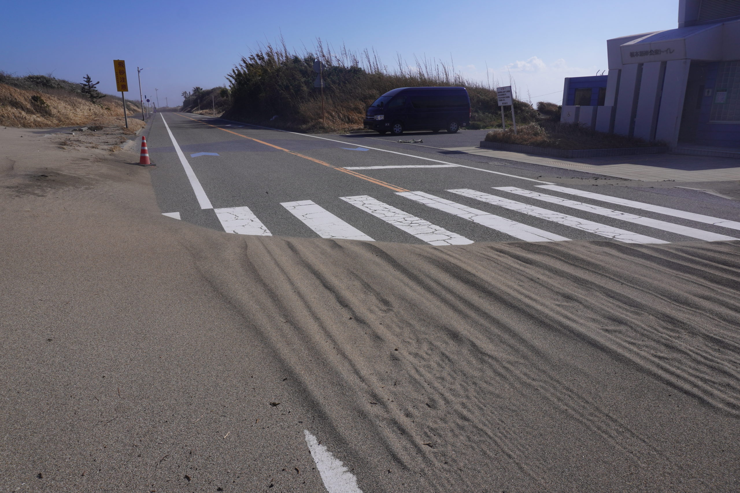 根本キャンプ場の跡地付近の道路では砂が大幅にはみ出していて、国道が砂に覆われていました。