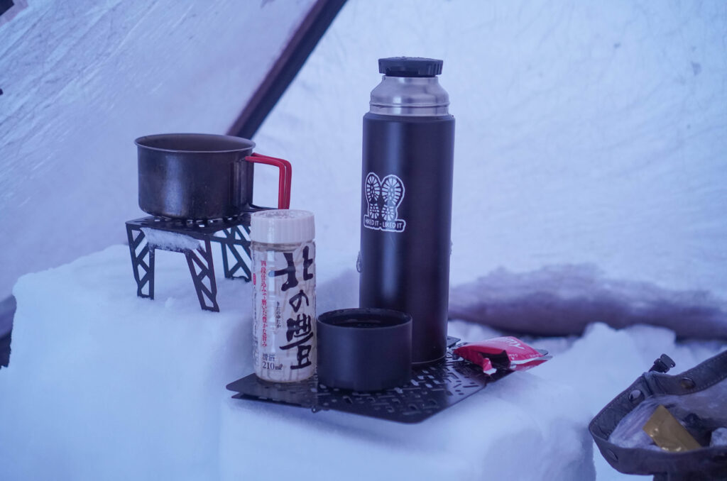 -10度を超える寒さの中で寝る前にお湯を入れておき、テントの脇に置いておいて就寝。それでも朝方暖かいです!バーナーを出す必要なく、起きていきなり白湯が飲めるので、とても優秀!