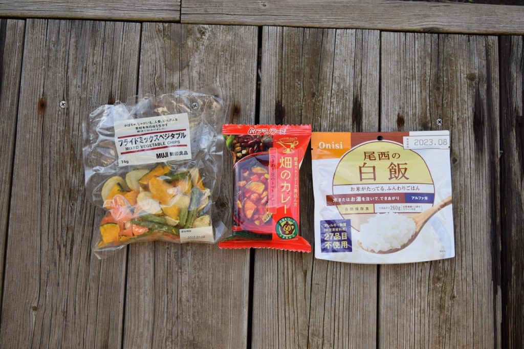 「アルファ米」と「ドライフーズのカレー」と「野菜チップス」。全てドライフーズで固めてみました。お値段なんですが、