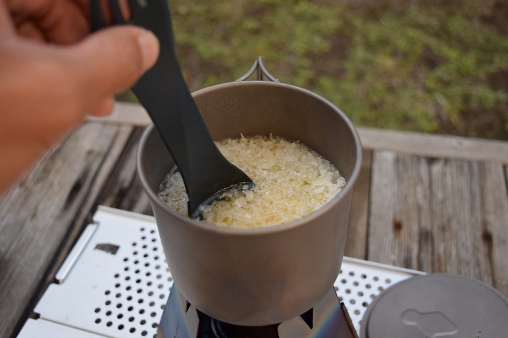 沸騰したらアルファ米を入れてよくかき混ぜましょう。