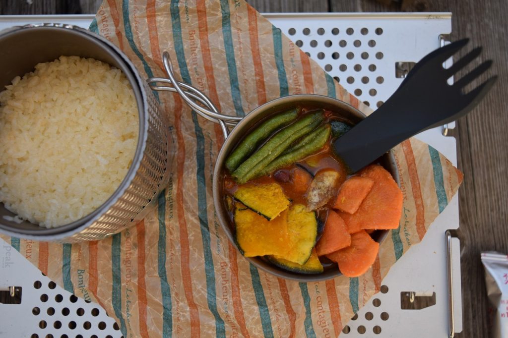 かき混ぜたらカレーの完成。これだけでも結構贅沢気分で満足できるんだけど、やっぱり「山のご飯!」って感じがしちゃうでしょう??