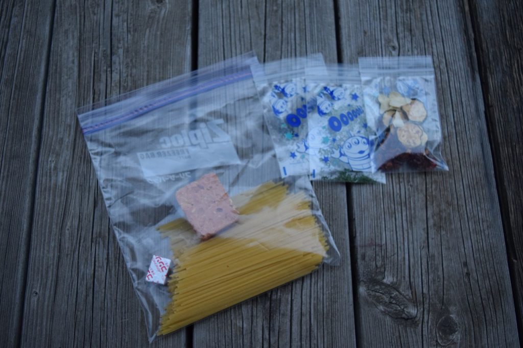 それらをきちんとジップロックに入れていきます。パスタはあらかじめ半分に折っとかないとジップロックには入りません。