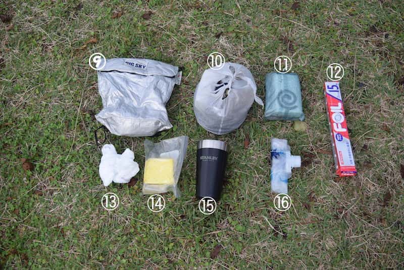 ⑩のクッカーセットの白いスタッフサックの中にはクッカーやバーナーが入っています。
