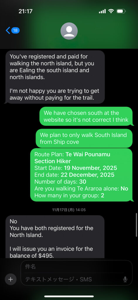 私たちは日本出国前、「Trail Feeを払えばパスも付いてくる」と思い込んでいたのですが、実際にはトレイルパスは有効化されず、事務局に問い合わせたところ、担当者とのSMSでのやり取りが始まりました。